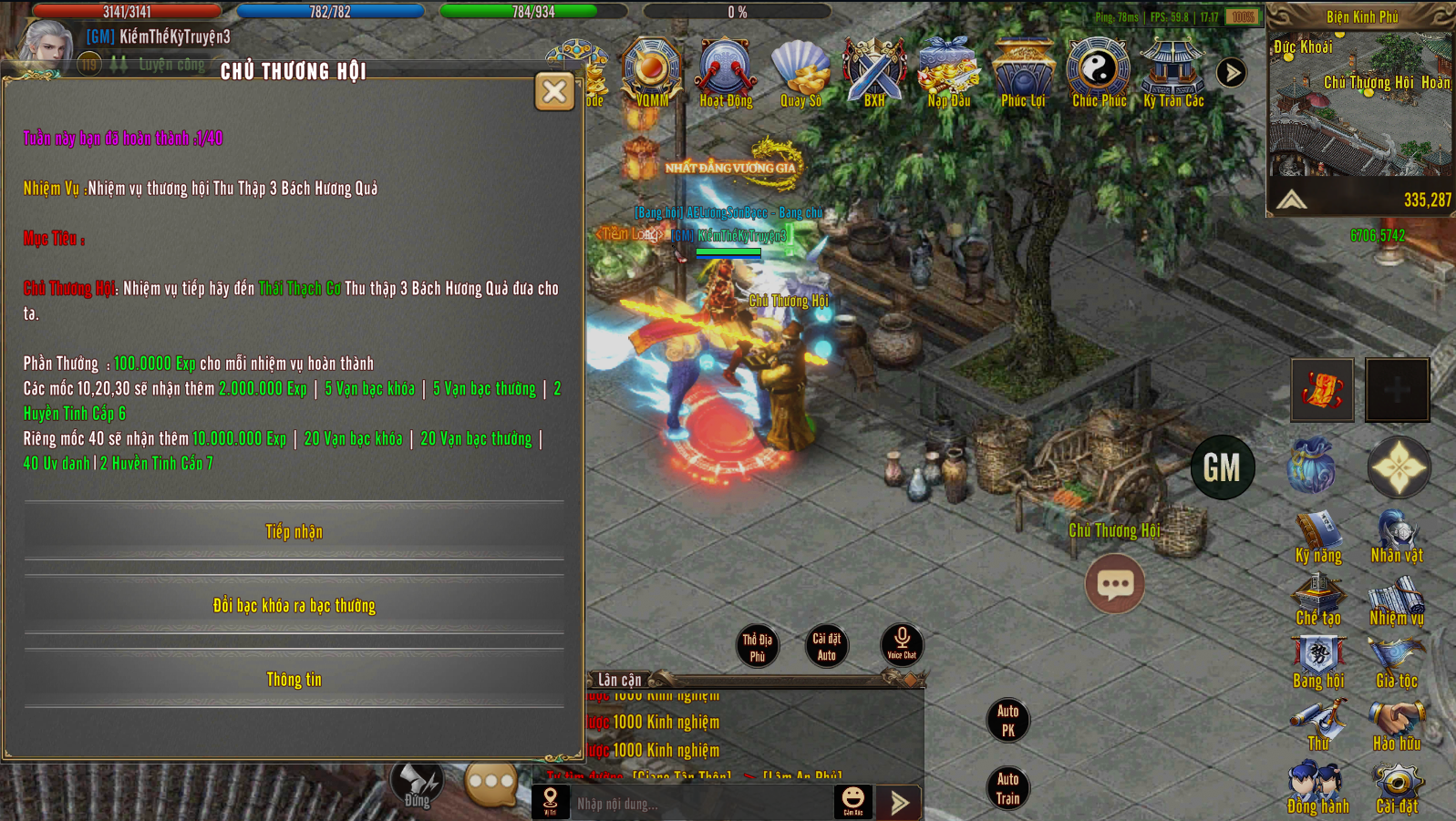 Hoàn thành 40 Nhiệm Vụ: 10.000.000 Exp, 10 Vạn Bạc Khóa,10 Vạn Bạc thường, 2 Huyền Tinh Cấp 7.