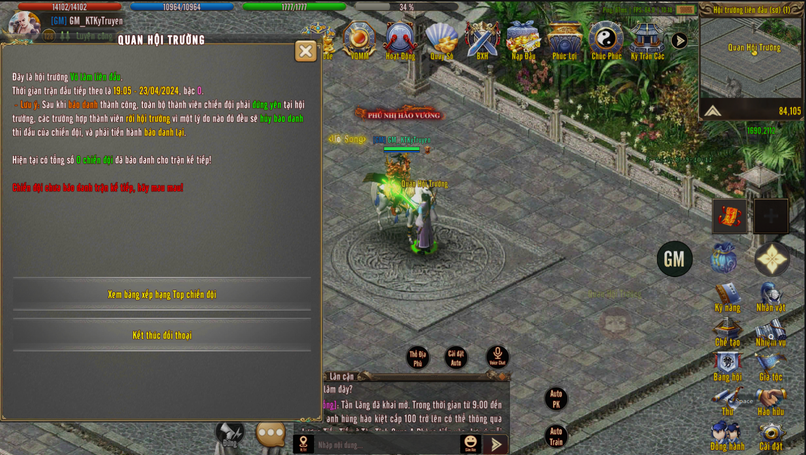 Khi bắt đầu diễn ra hoạt động các thành viên sẽ đến trước NPC Quan Liên Đấu để tiến vào Khu chuẩn bị, và báo danh với NPC Quan Hội Trường để đăng ký trận đấu.